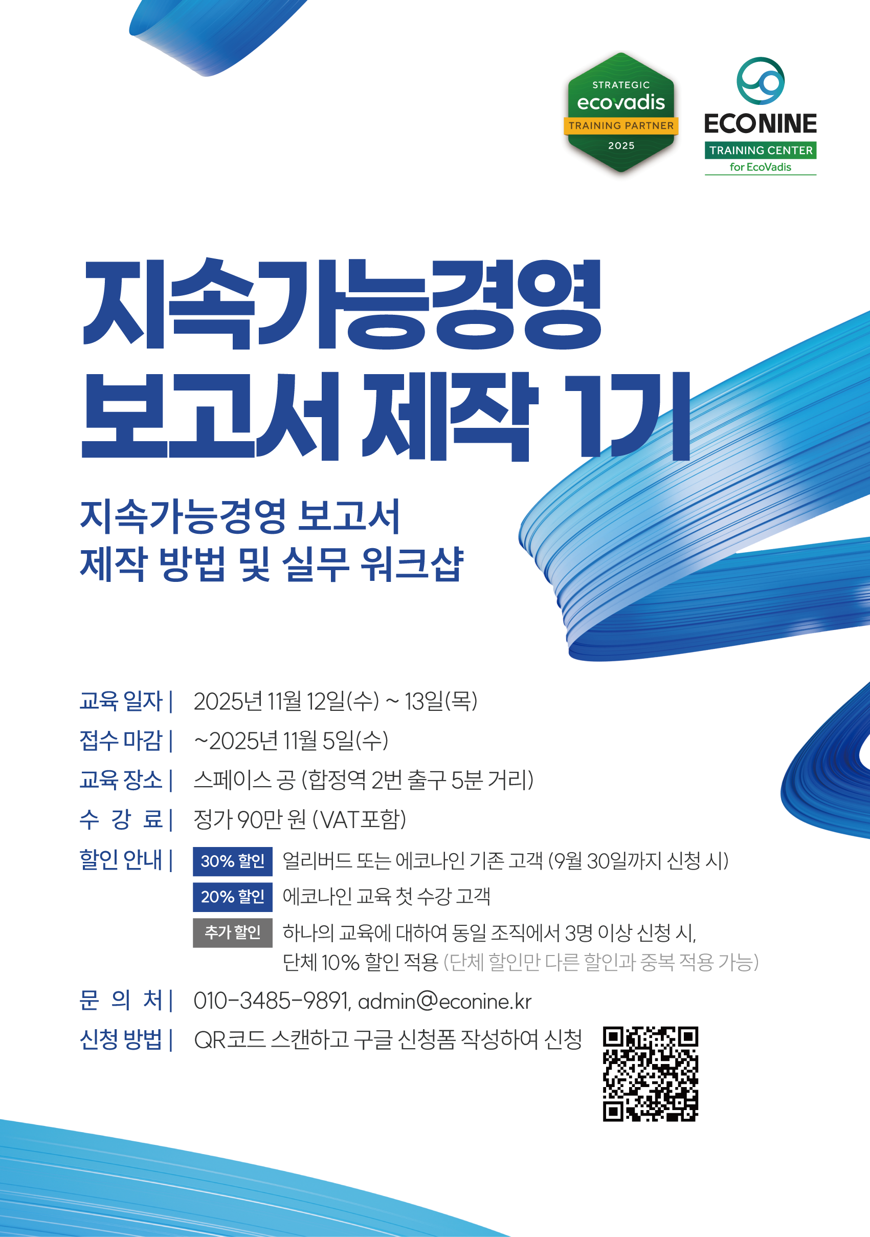 이러한 추세를 반영해 에코나인은 오는 11월, ‘제8회 EcoVadis 웨비나’와 ‘지속가능경영 보고서 제작 1기' 교육을 연계 진행하며 ESG 공시 대응과 보고서 실무를 동시에 강화할 수 있는 2025년 마지막 교육 기회를 제공합니다.