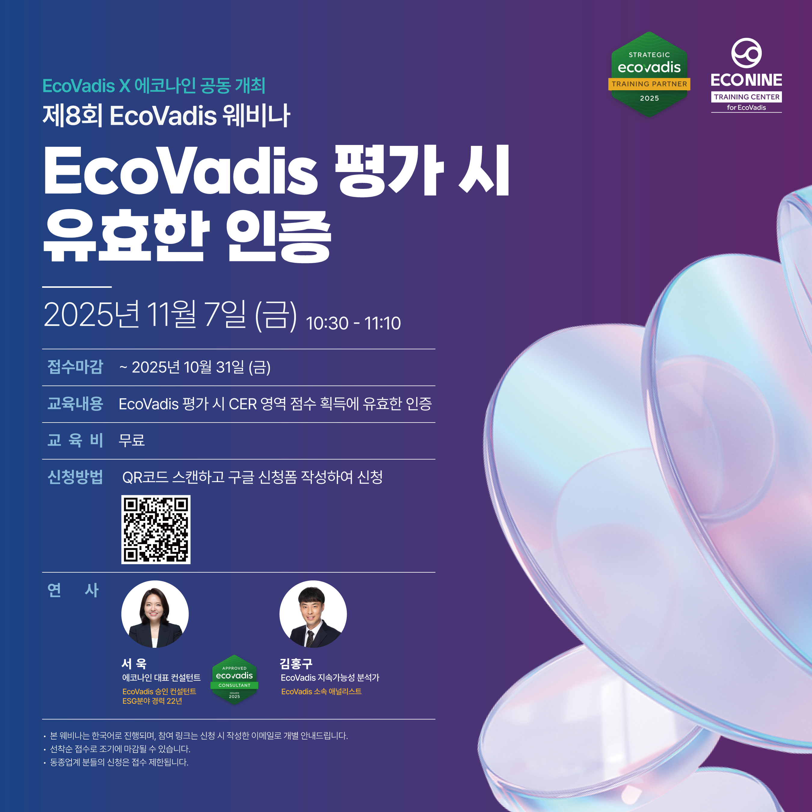 다가오는 연말, 「에코나인 EcoVadis 트레이닝 센터」에서 준비한 2025 ESG 교육 프로그램을 안내합니다.